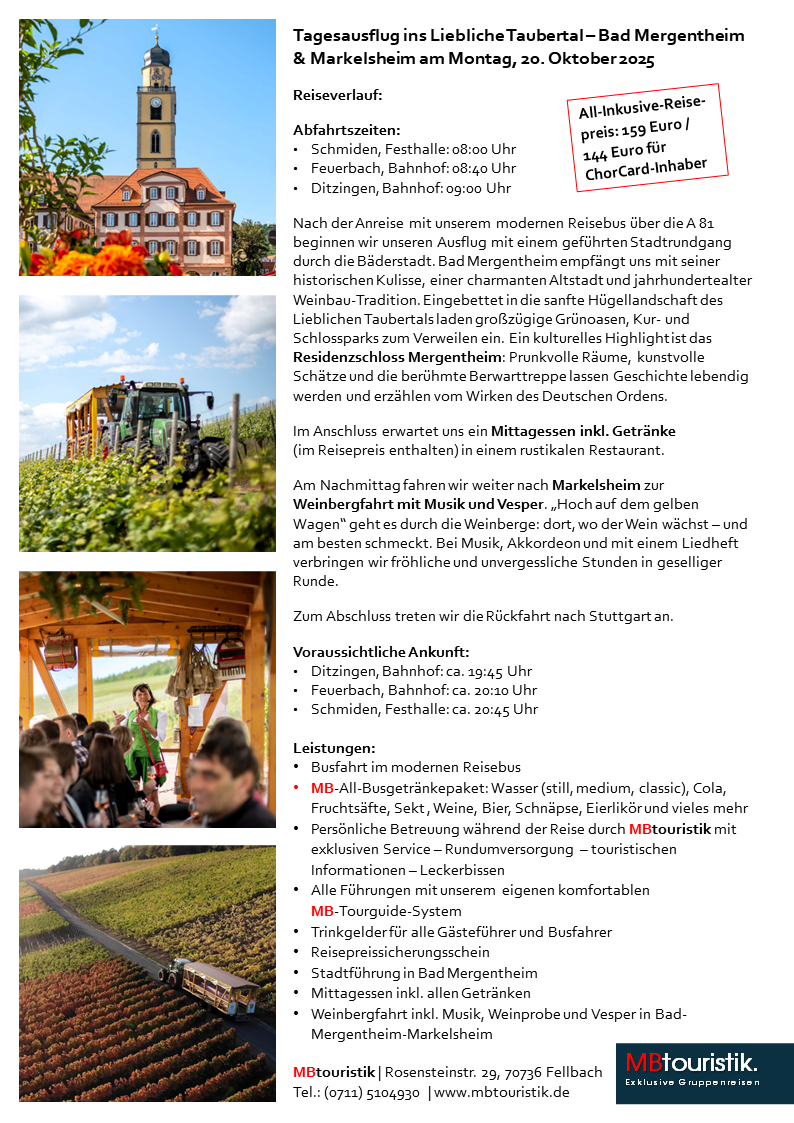 Fahrt im Reisebus von Stuttgart nach Bad Mergentheim mit geführtem Stadtrundgang und anschließendem Mittagessen inkl. Getränke. Am Nachmittag Weinbergfahrt „Hoch auf dem gelben Wagen“ in Markelsheim mit Musik und Vesper – fröhliche, gesellige Stunden inmitten der Weinberge.